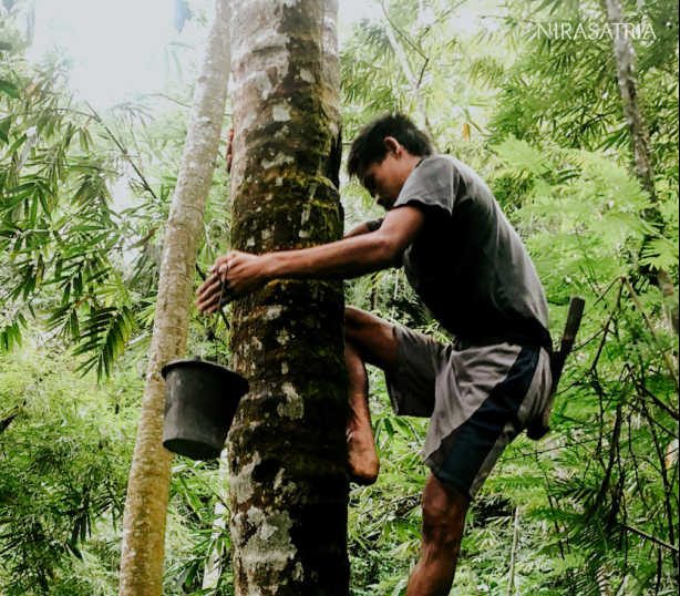 The production of organic coconut sugar in Nirasatria begins with tapping the flower bud of a coconut palm tree to extract its sap. Tapping involves making a cut in the flower bud and collecting the sap in containers. This process is similar to tapping for other palm-based products, such as palm wine or palm syrup.